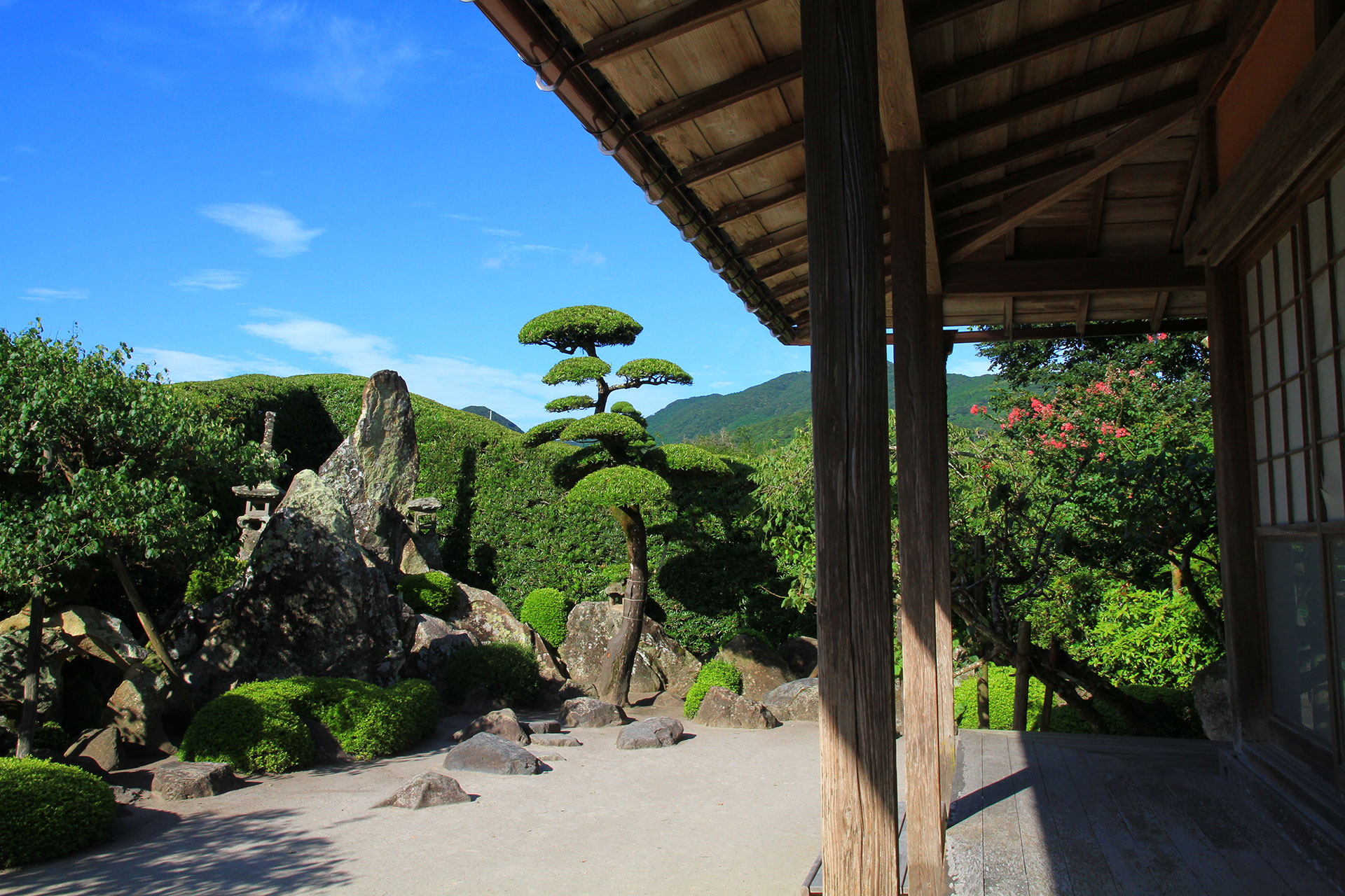 庭園は主屋の北にあり、北東隅に築山を設け大きな立石で枯滝を組み、石垣はさらに西へ連なり、間にウメ、イヌマキ(知覧ではヒトツバという)の古木を配している。