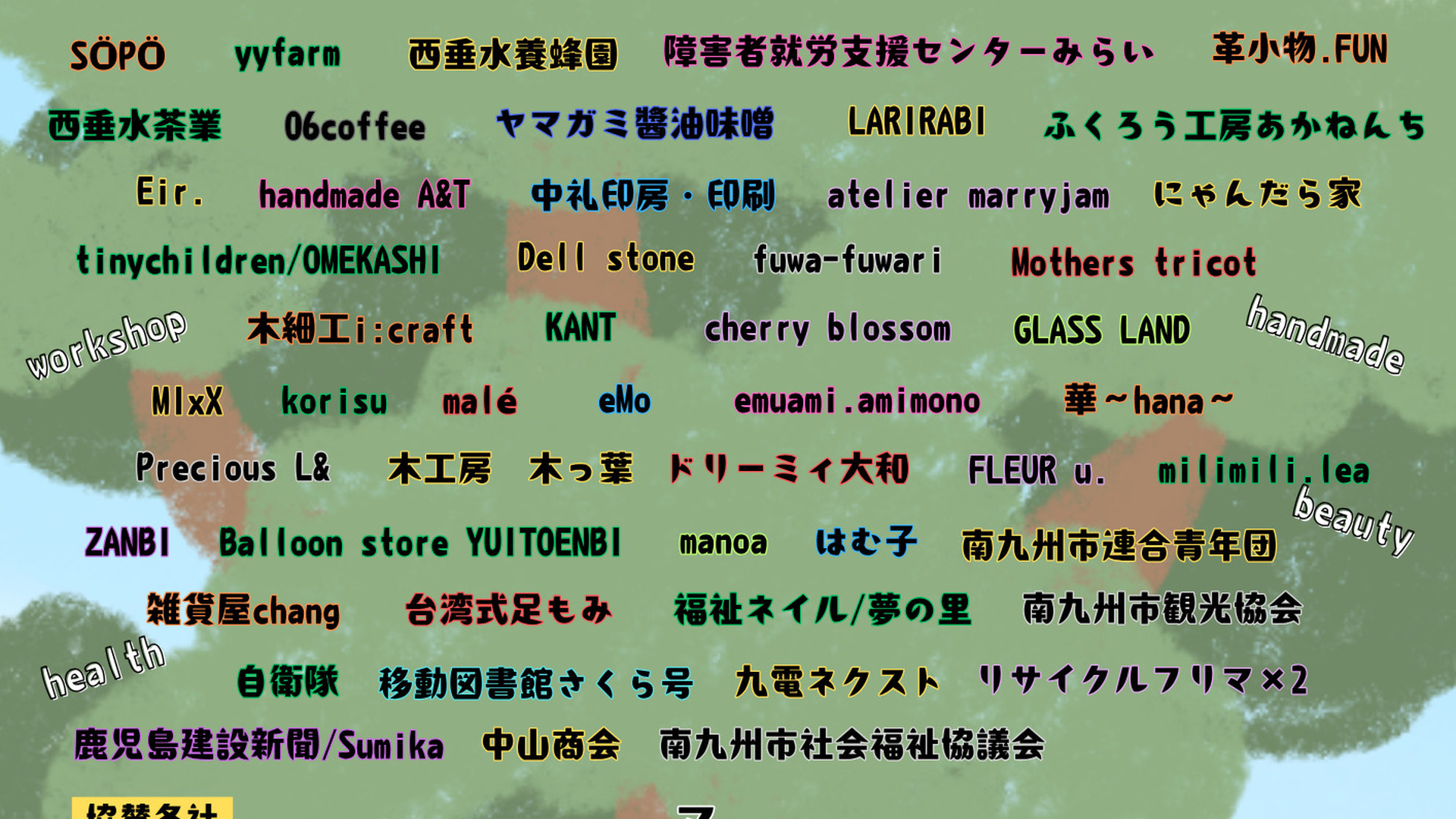 キッチンカー、グルメ、ハンドメイド、ワークショップ、物販など約100店舗が立ち並び、自衛隊や地元企業の参加、また鹿児島で有名なアーティストグループや地域の子供たちによるダンス披露など「ステージイベント」も満載です。このマルシェで緑が広がる中、一日中楽しみませんか。
