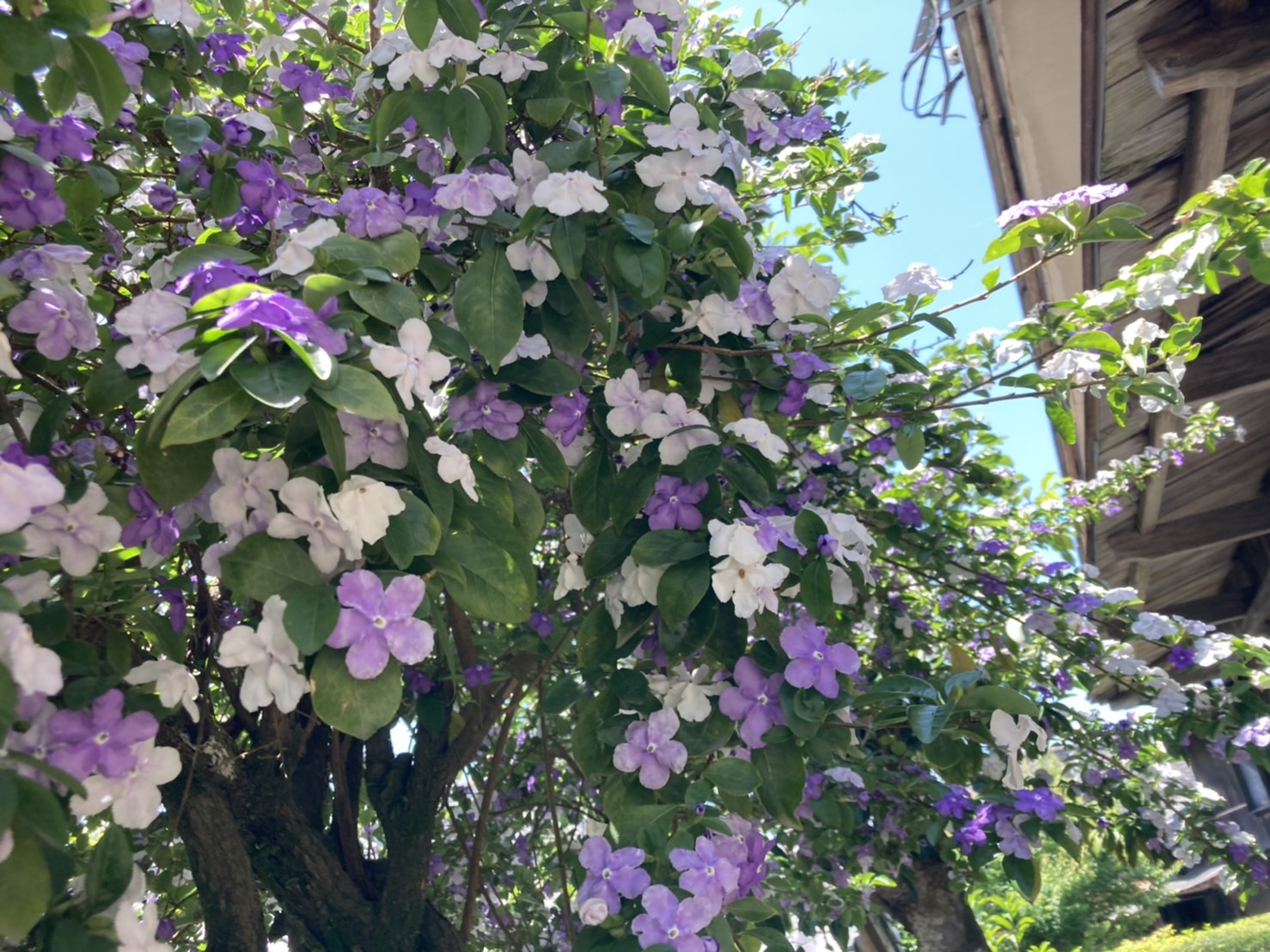 また今の時期は、紫色と白色が混在した花「ニオイバンマツリ」別名「アメリカンジャスミン」が見頃です!!武家屋敷7番庭園周辺に咲いています。
