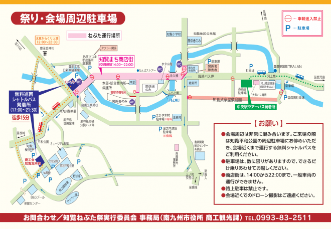 ご来場の際は,「知覧平和公園周辺」の駐車場にお停めいただき,会場近くまで運行する無料シャトルバス(運行時間:17時~21時30分)をご利用ください。