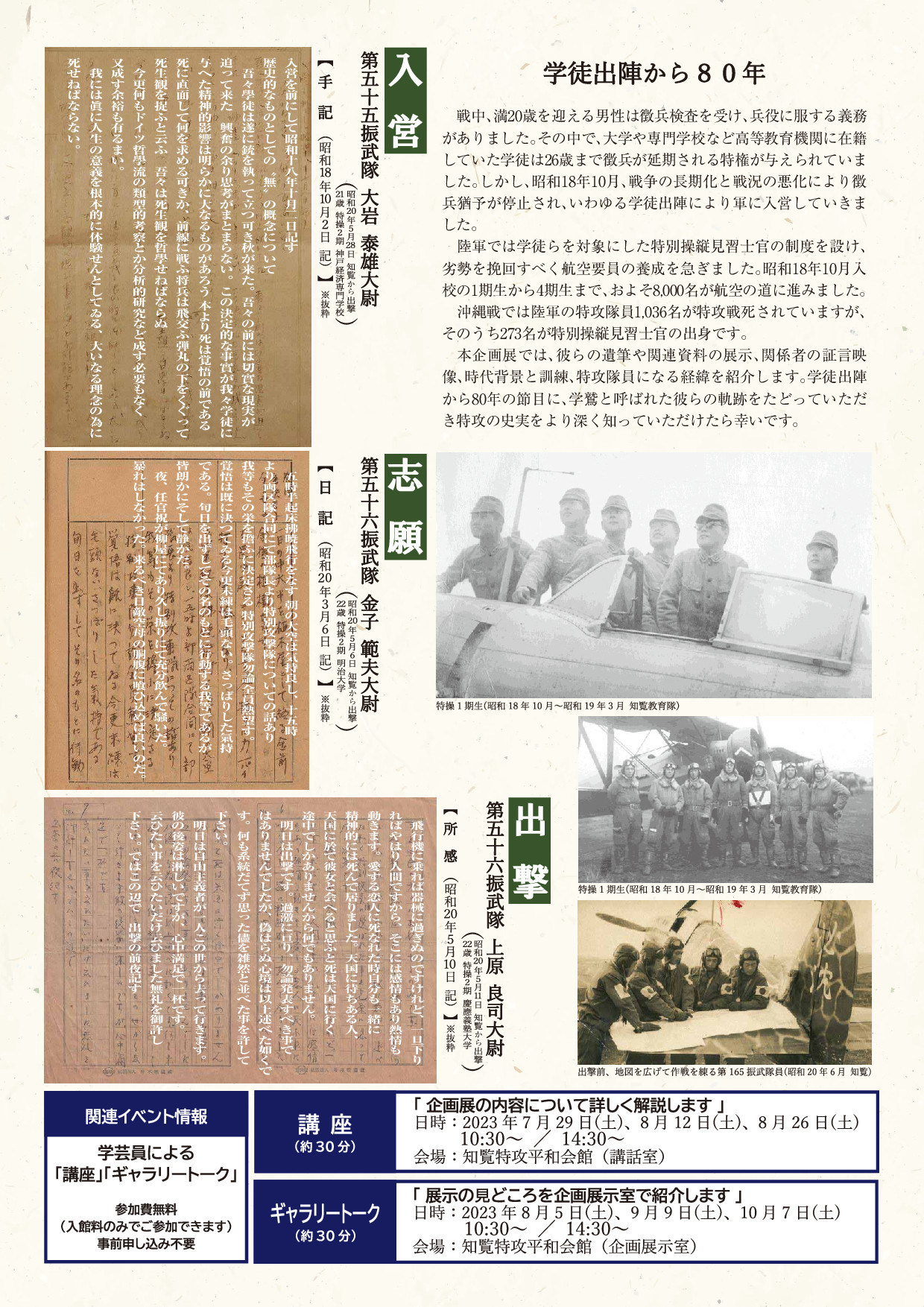 今年は学徒出陣から80年を迎えます。沖縄戦では陸軍の特攻隊員1,036名が特攻戦死されていますが、そのうち273名が特別操縦見習士官の出身です。本企画展では、彼らの遺筆や関連資料の展示、関係者の証言映像、時代背景と訓練、特攻隊員になる経緯を紹介します。学徒出陣から80年の節目に、学鷲と呼ばれた彼らの軌跡をたどっていただき特攻の史実をより深く知っていただく企画展となっております。