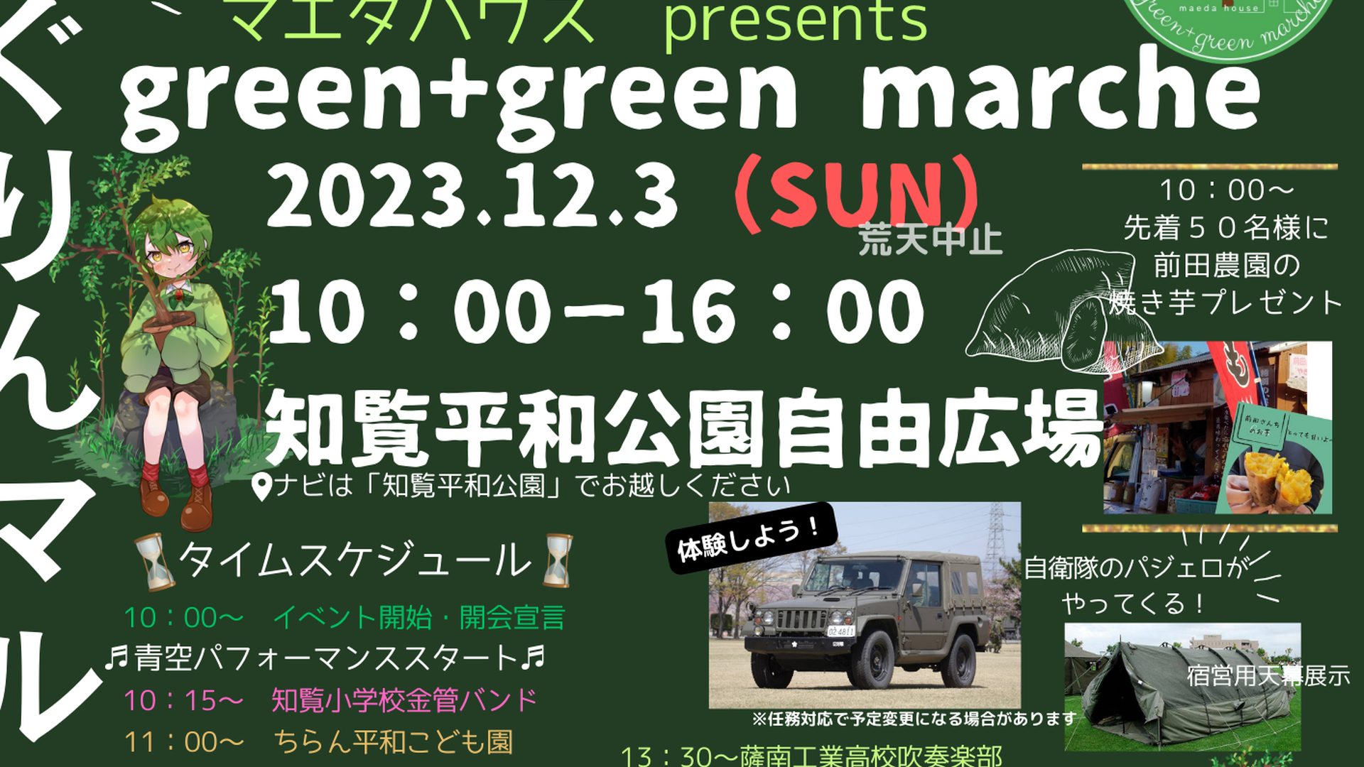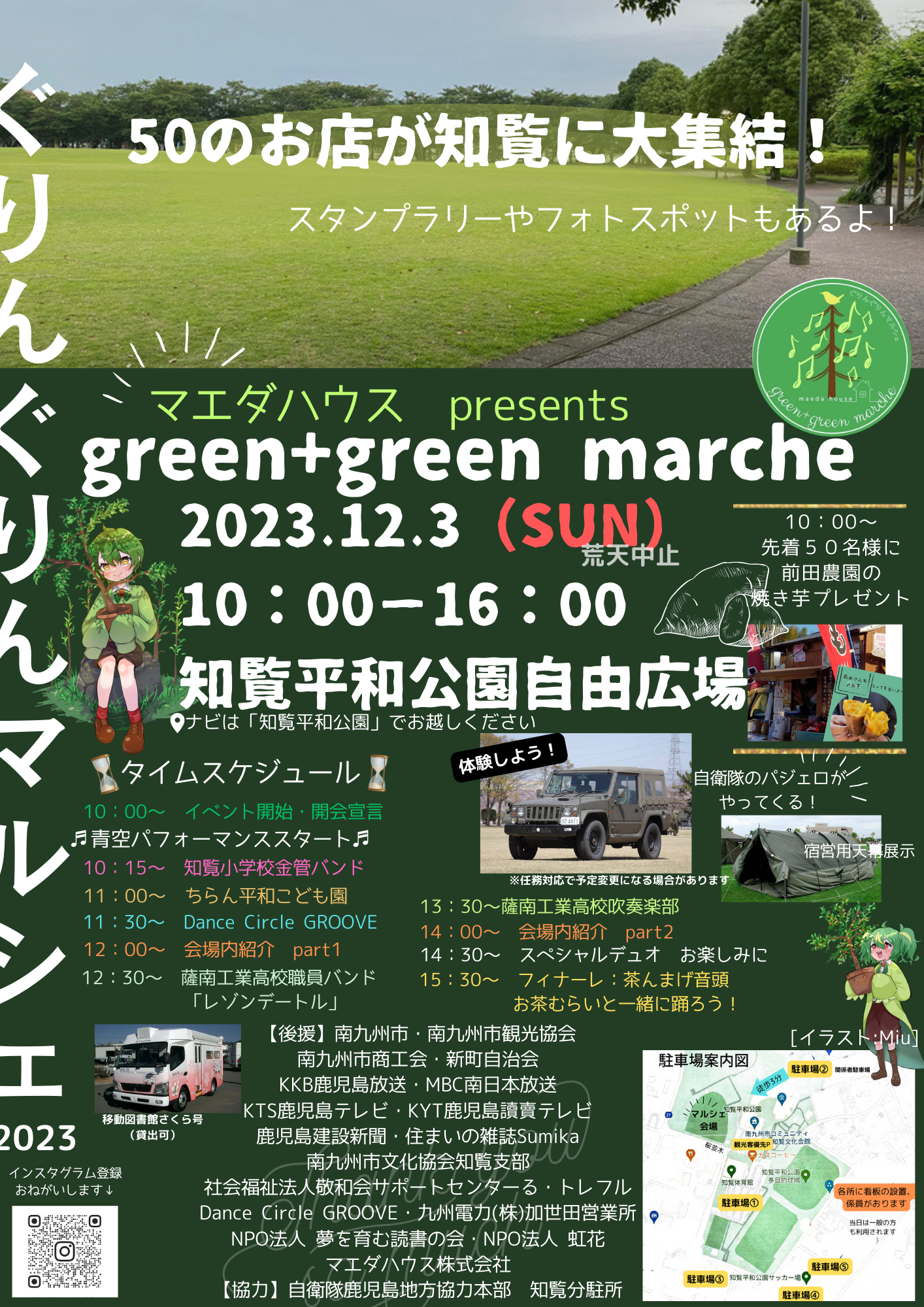 12月3日(日)、知覧平和公園自由広場で「green+green marche」が開催されます。約50店舗のお店が大集合し、ワークショップや演奏ステージもあります!