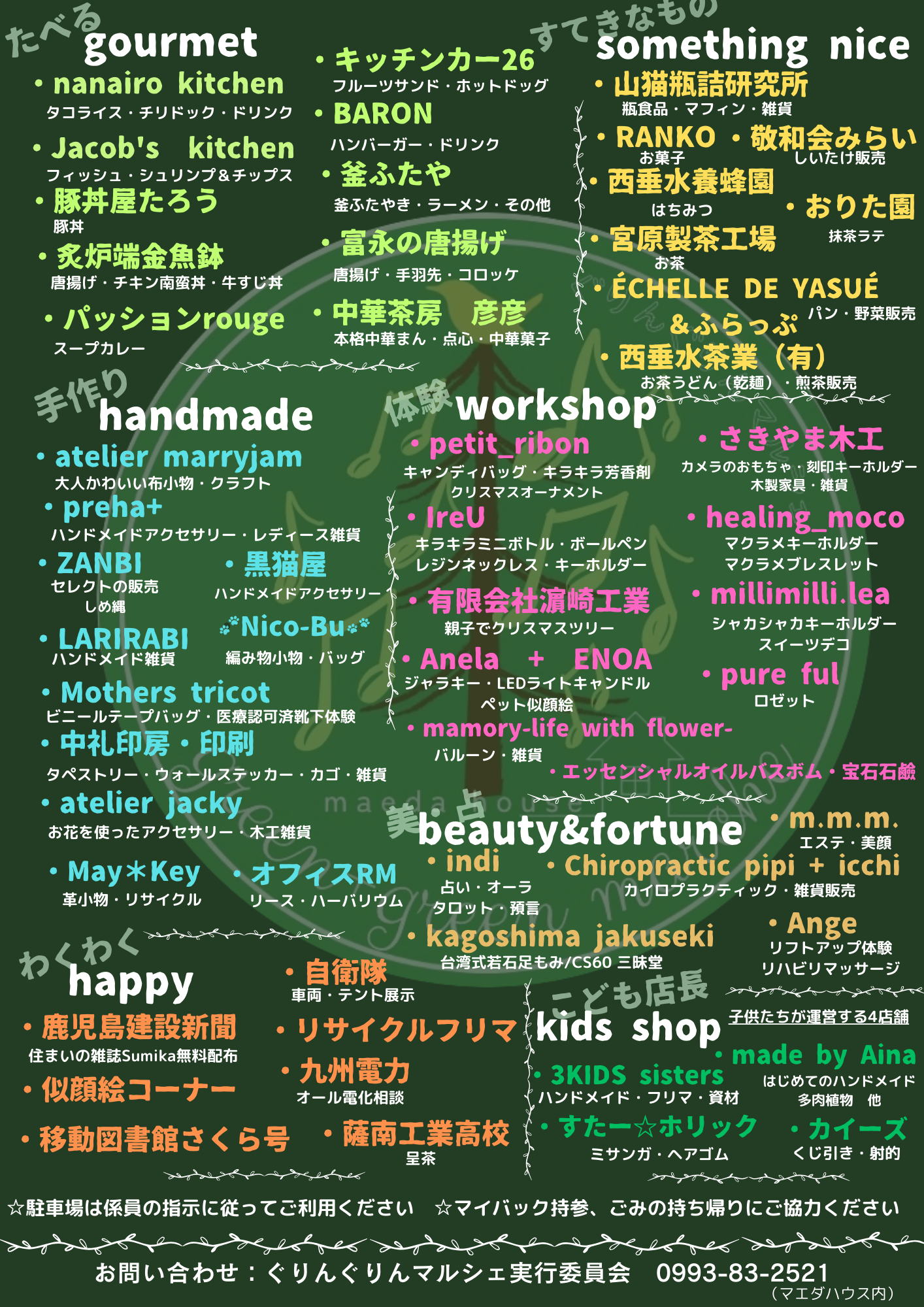 <お問合せ先>ぐりんぐりんマルシェ実行委員会 TEL:0993-83-2521(マエダハウス)