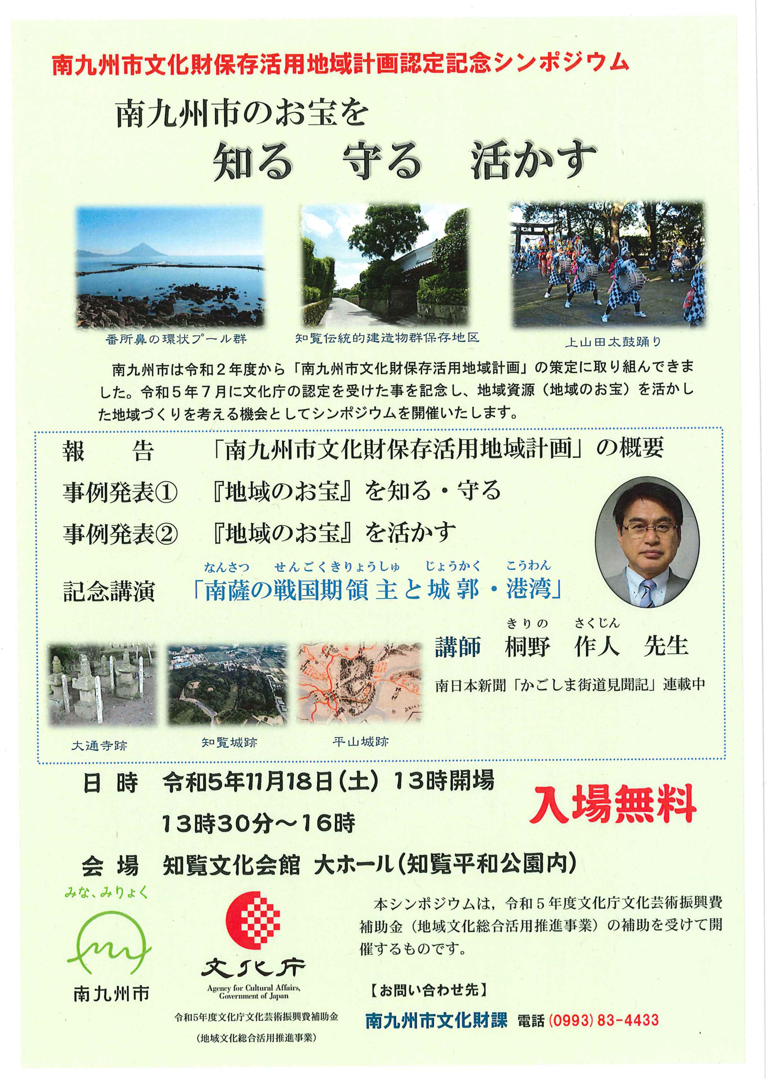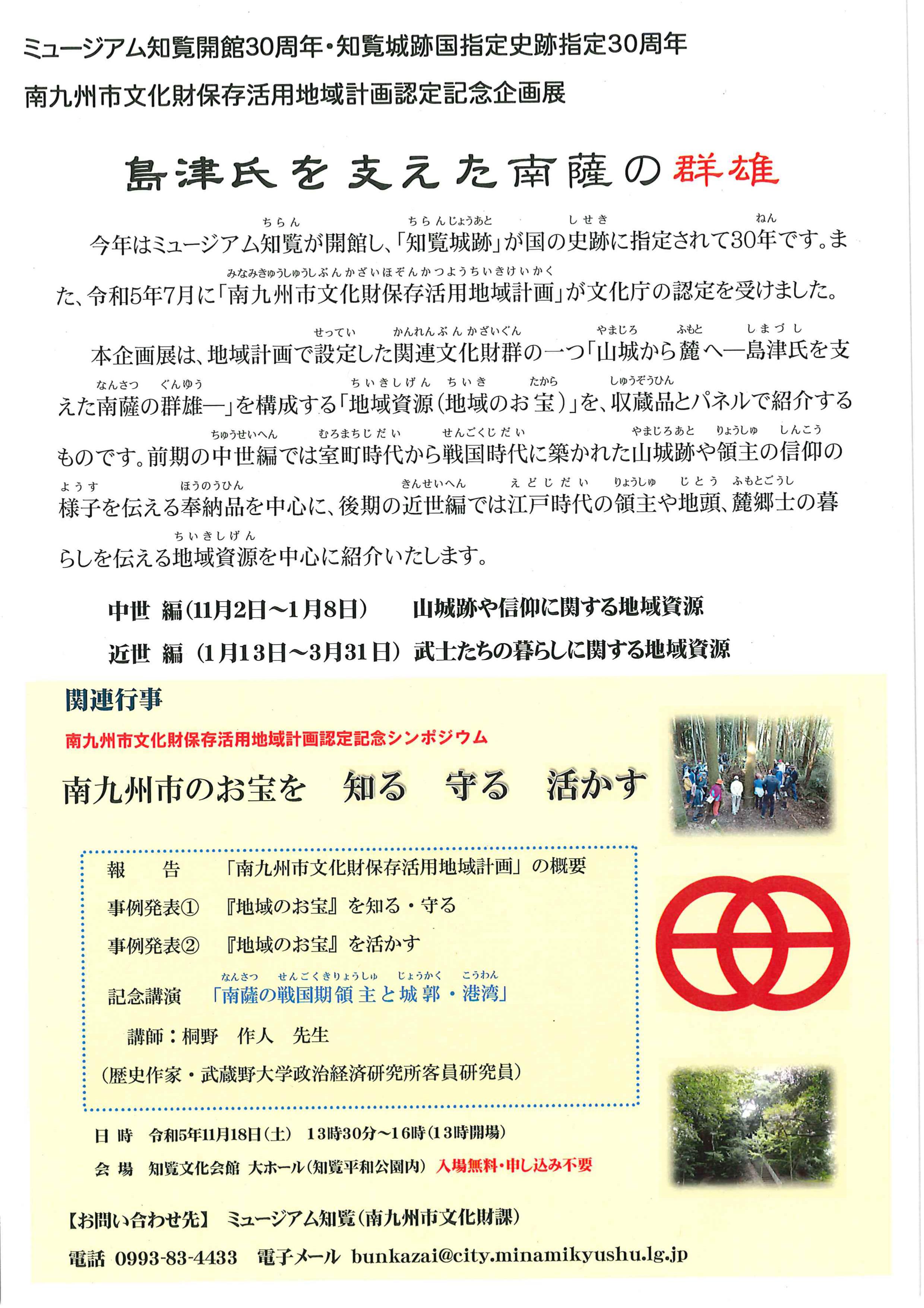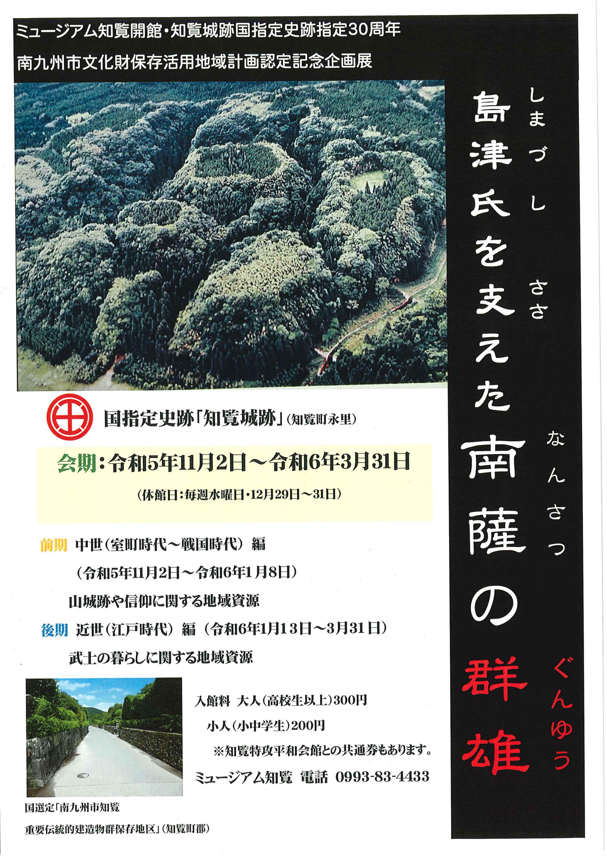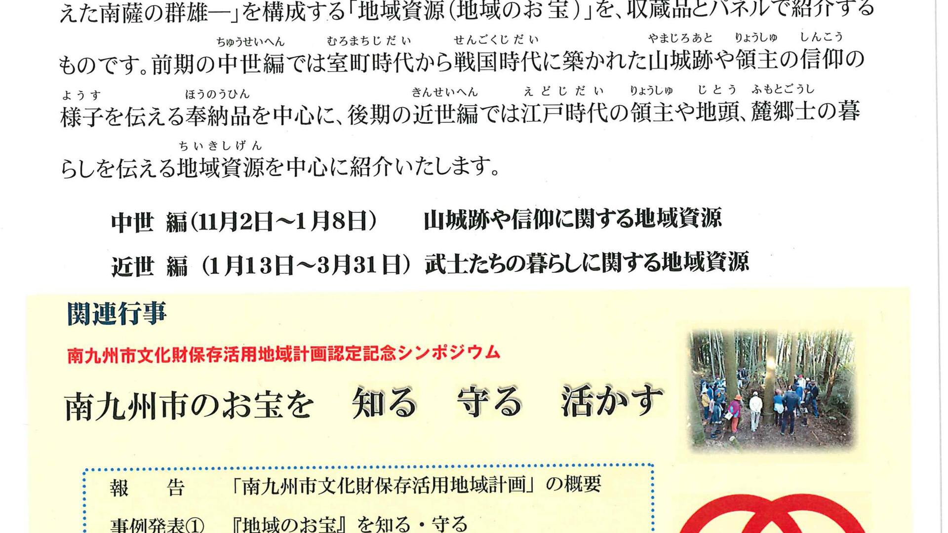 ミュージアム知覧では、ミュージアム知覧開館・知覧城跡国指定史跡指定30周年 南九州市文化財保存活用地域計画認定記念企画展「島津氏を支えた南薩の群雄」を開催中です。山城跡や信仰に関する地域資源、武士たちの暮らしに関する地域資源ををご紹介しますのでぜひご覧ください。※南九州市文化財保存活用地域計画認定記念シンポジウム「南九州市お宝を知る 守る 活かす」も開催します。 詳細はチラシでご確認ください。