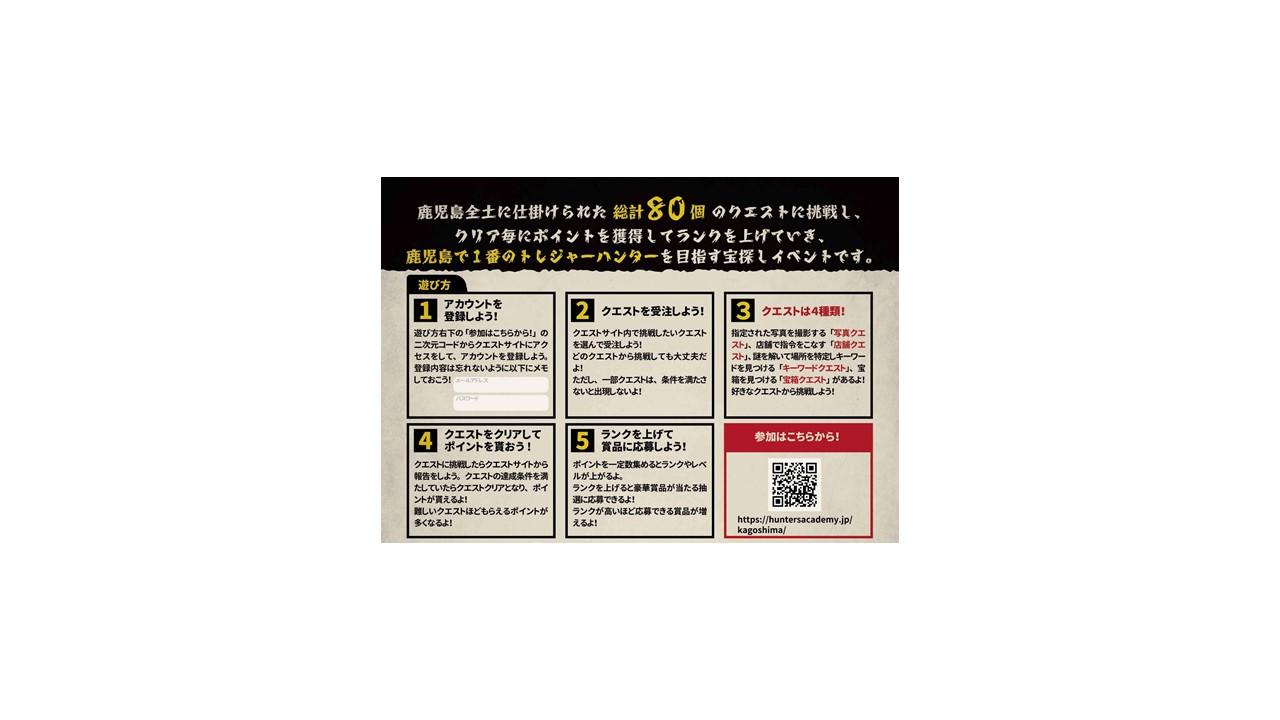 宝探しハンターとして、鶴丸城御楼門や道の駅など、県内各地にあるクエスト(課題)をクリアしてハンターレベルを上げると、到達したレベルに応じて総額50万円分の豪華賞品を抽選でプレゼントします!