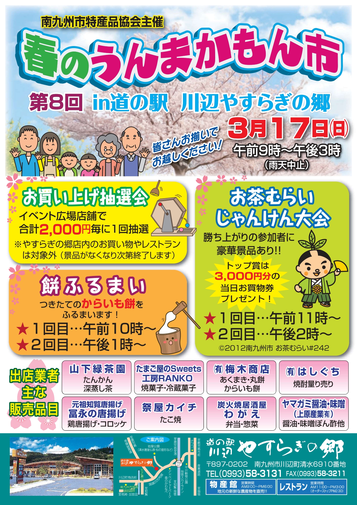 南九州市特産品協会主催の「春のうんまかもん市」が道の駅川辺やすらぎの郷で開催されます。