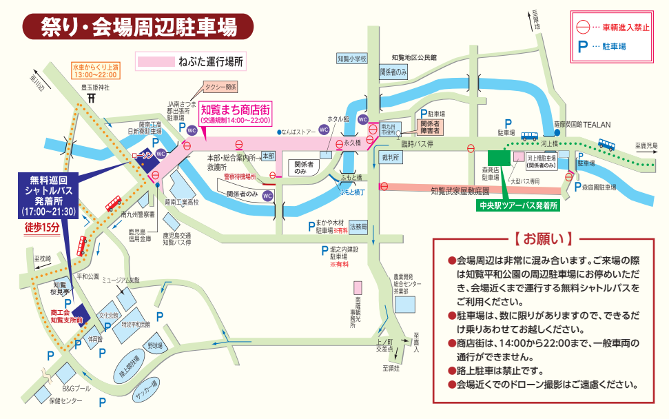 ★ご来場の際は,「知覧平和公園周辺」の駐車場にお停めいただき,会場近くまで運行する無料シャトルバス(運行時間:17時から21時30分)をご利用ください。