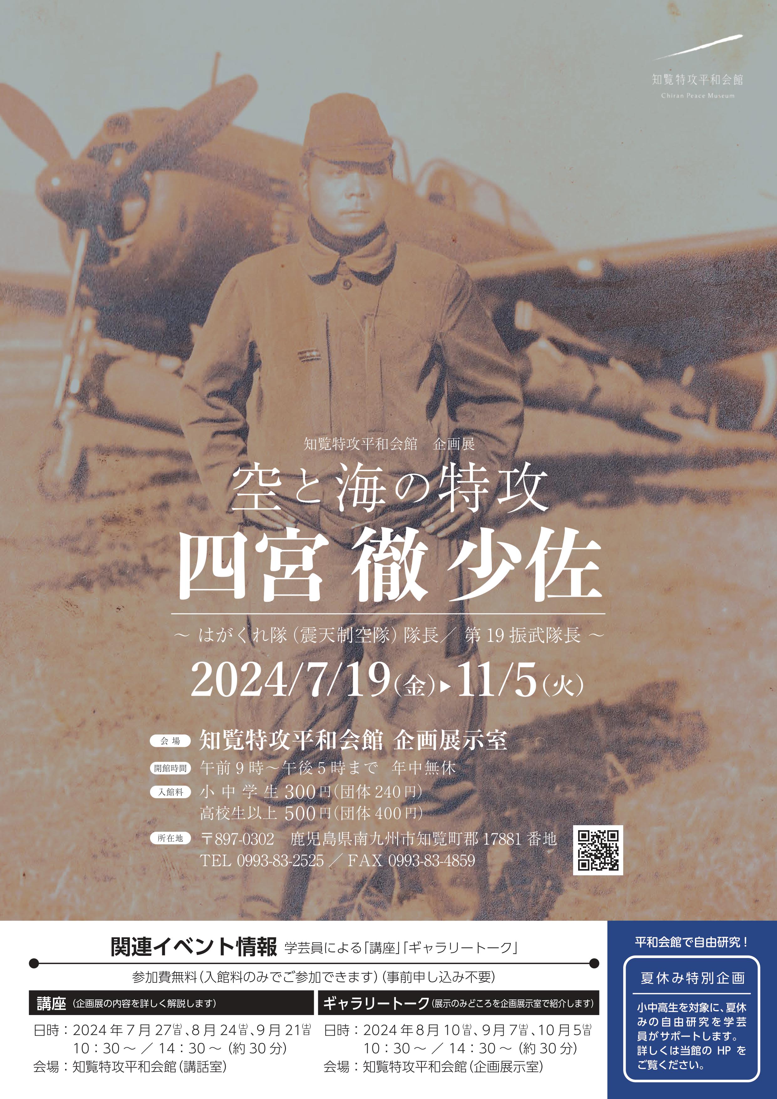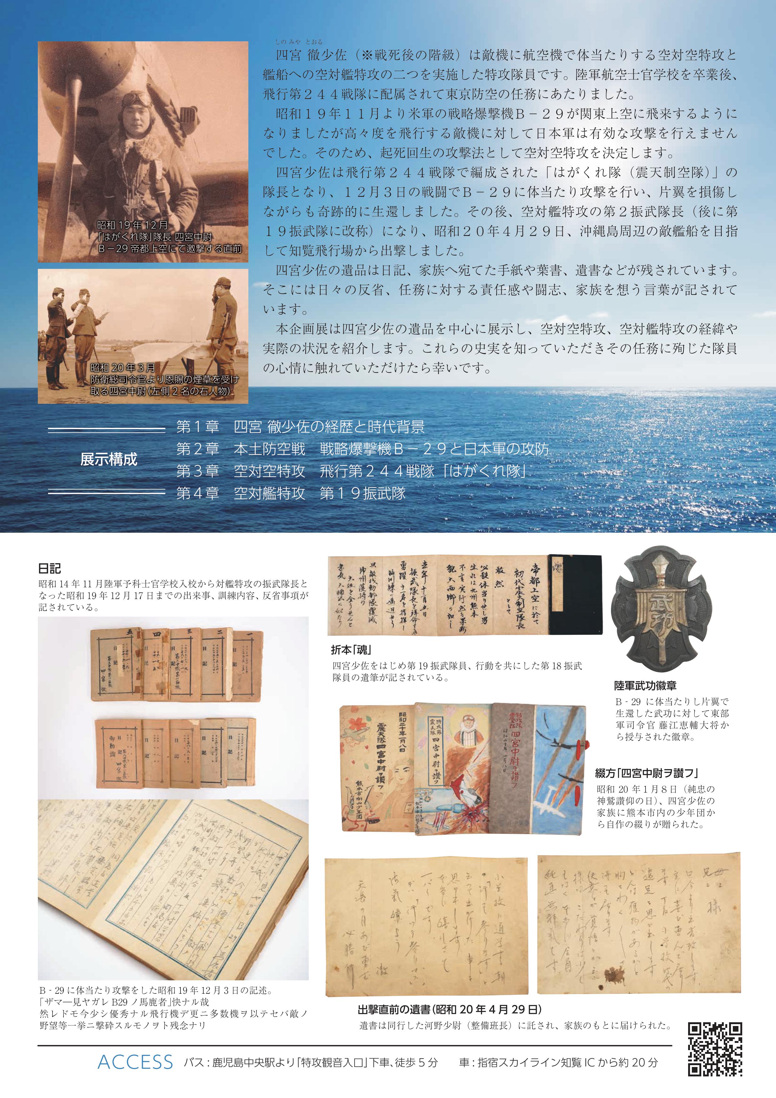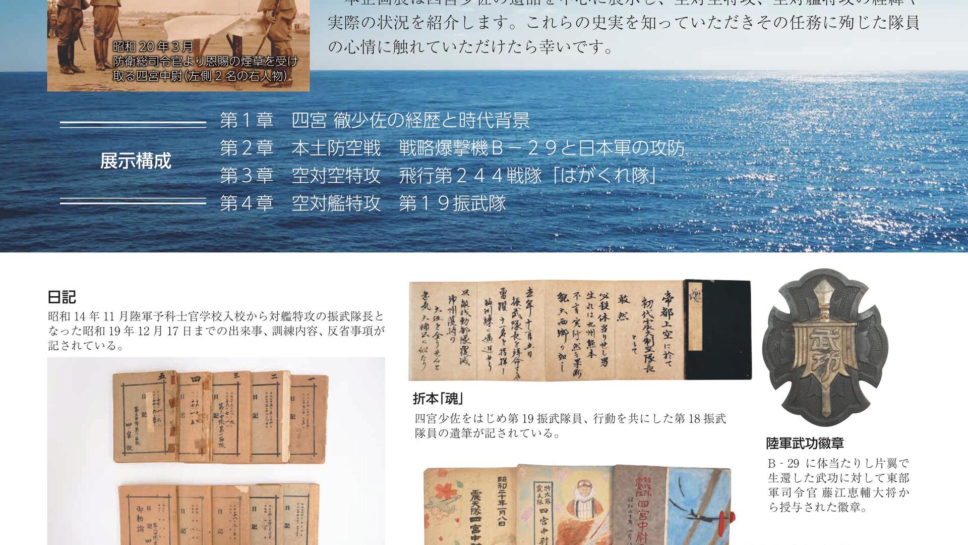 本企画展は四宮少佐の遺品を中心に展示し、空対空特攻、空対艦特攻の経緯や実際の状況を紹介します。