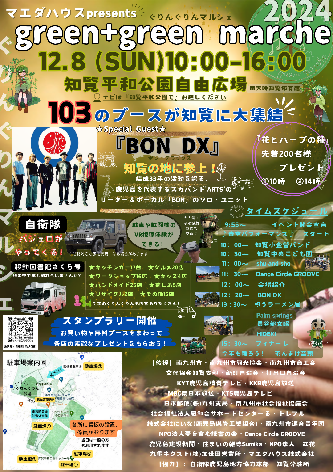 キッチンカー、グルメ、ハンドメイド、ワークショップなど103の出店があり、自衛隊や地元企業の参加、また鹿児島で有名なアーティストグループによるステージなどで会場を盛り上げます!!