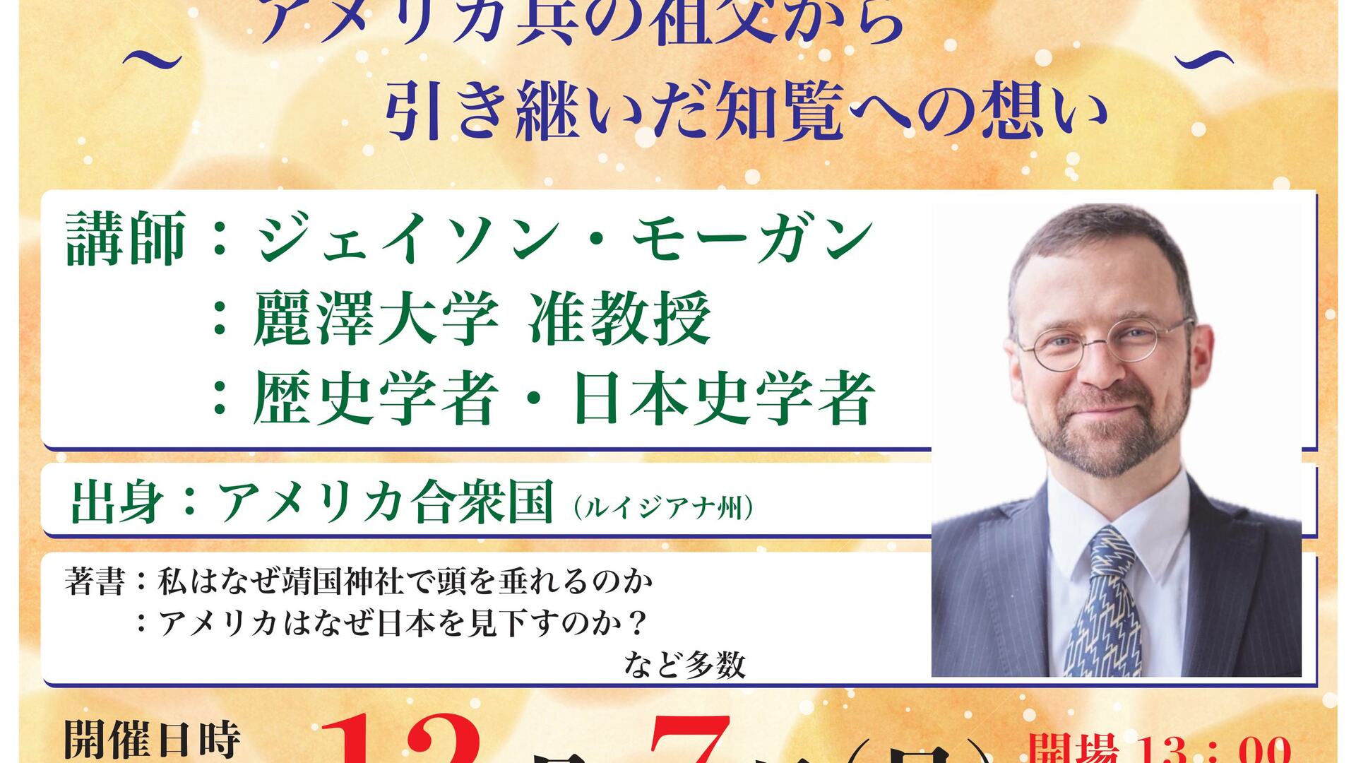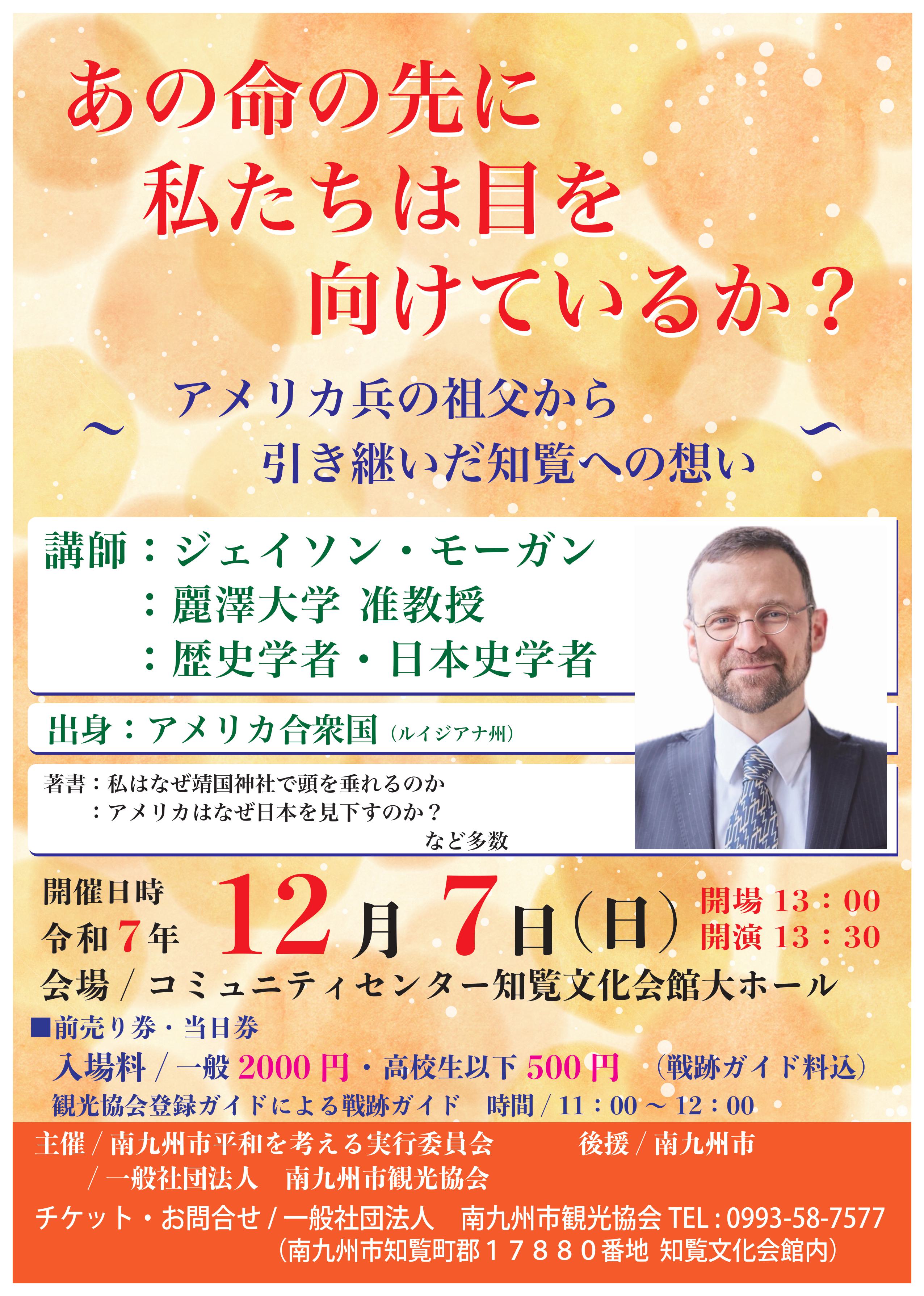 令和7年12月7日(日)、歴史学者であるジェイソン・モーガン氏の講演会を開催いたします。戦後80年の年に初めて南九州市で講演を行いますのでぜひご視聴ください。