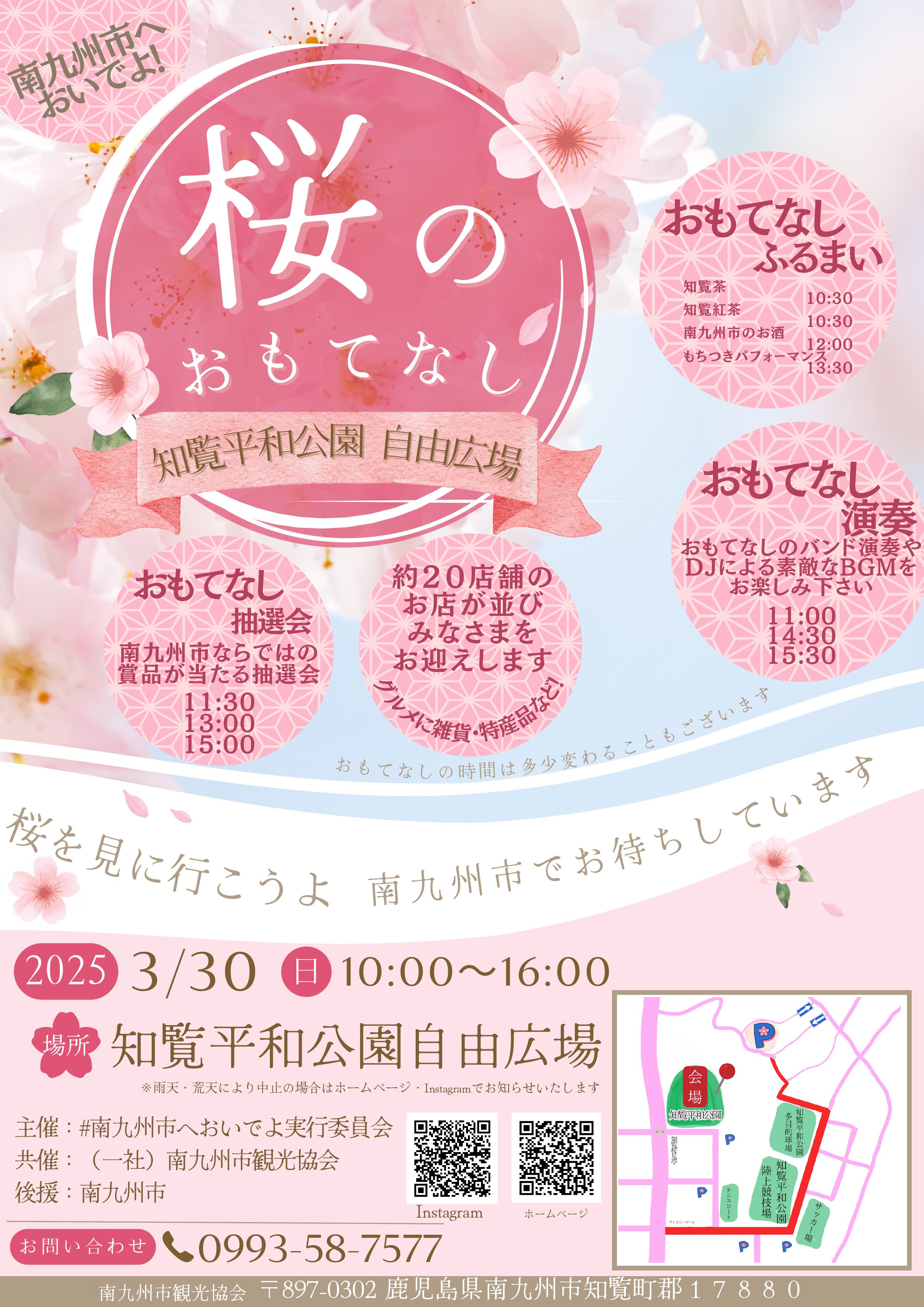 3月30日(日)、知覧平和公園自由広場で「南九州市へおいでよ!桜のおもてなし」イベントを開催いたします。毎年多くのお客様が桜を楽しみにお越しいただきますので、おもてなしイベントとして今回初めての開催となります。
