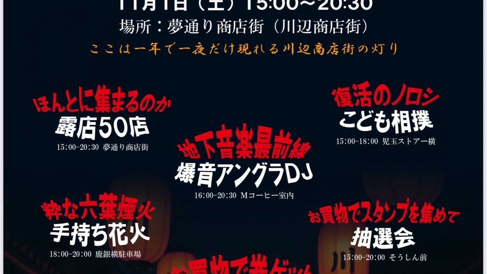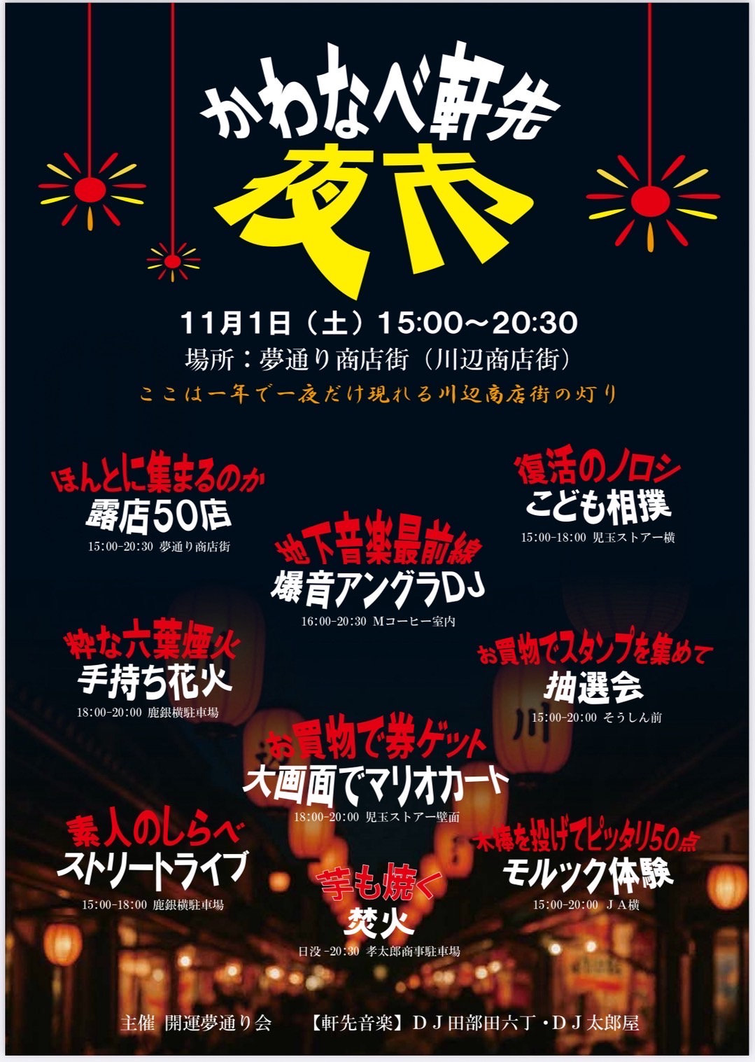 11月1日(土)に、かわなべ軒先夜市を開催します。たくさんの催し事がありますのでぜひ遊びに来てくださいね!!
