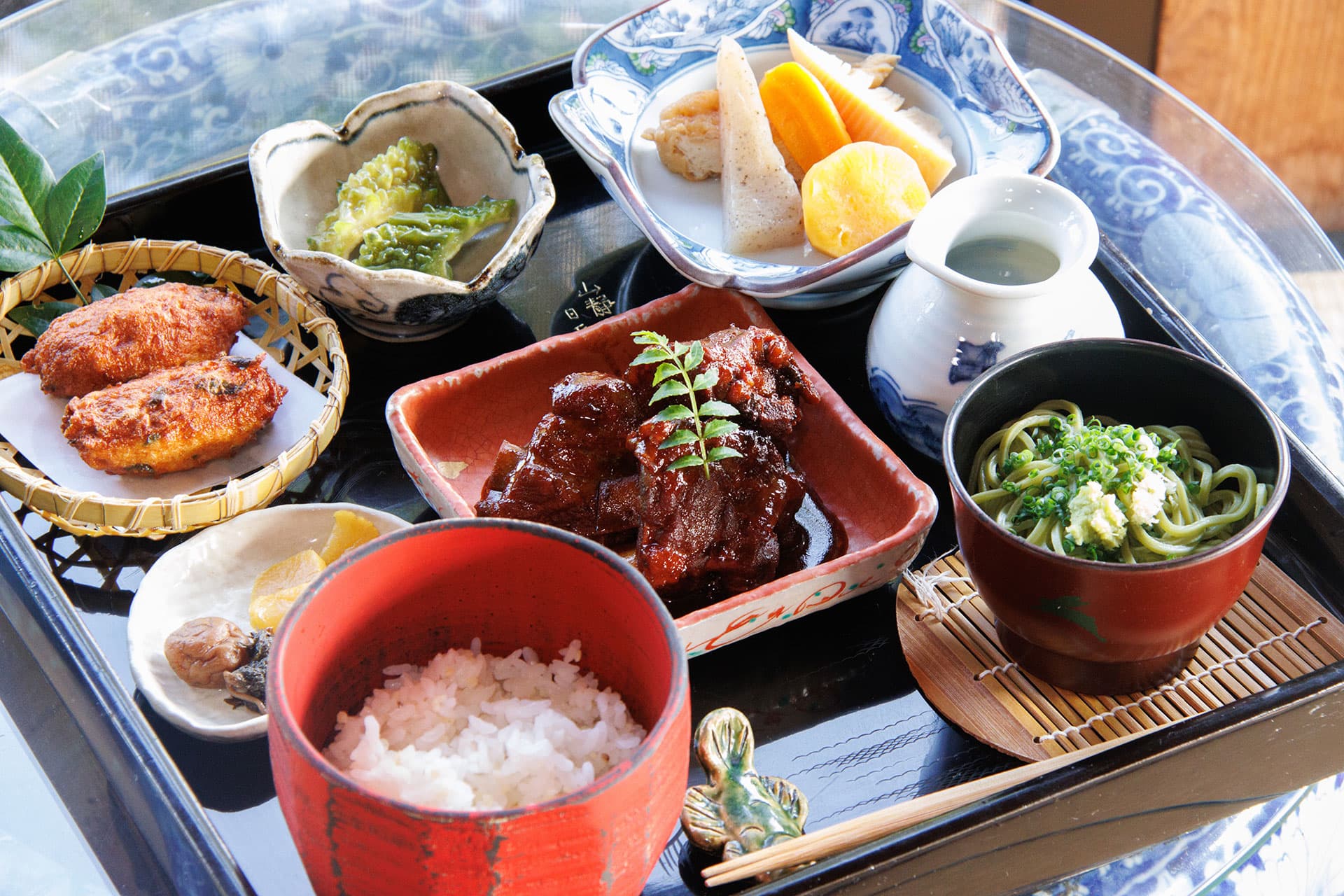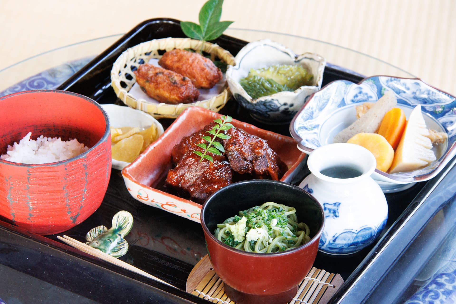日本遺産に登録された知覧武家屋敷庭園内にある武家屋敷をそのまま利用した郷土料理店です。時季の食材、地の食材を活かした郷土料理をミニ懐石風にお出しいたします。